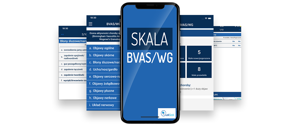 Skala BVAS/WG to narzędzie w formie kwestionariusza, służące do pomiaru nasilenia chorób z grupy zapalenia naczyń. BVAS/WG jest skróconą wersją tej skali. Stosuje się ją do oceny aktywności ziarniniaka Wegenera.Prezentowana bezpłatna aplikacja to wygodny sposób na skorzystanie ze skali BVAS/WG, w dowolnym momencie, bez konieczności wypełniania drukowanych formularzy. Układ aplikacji odzwierciedla budowę kwestionariusza. Składa się z 9 głównych modułów (oraz dodatkowego „Inne”), które odpowiadają grupom narządów i układów. W każdej grupie wymienione są objawy chorobowe. Można im przypisać odpowiednio 1 lub 3 punkty (1 to tzw. mały objaw, 3 – duży objaw).